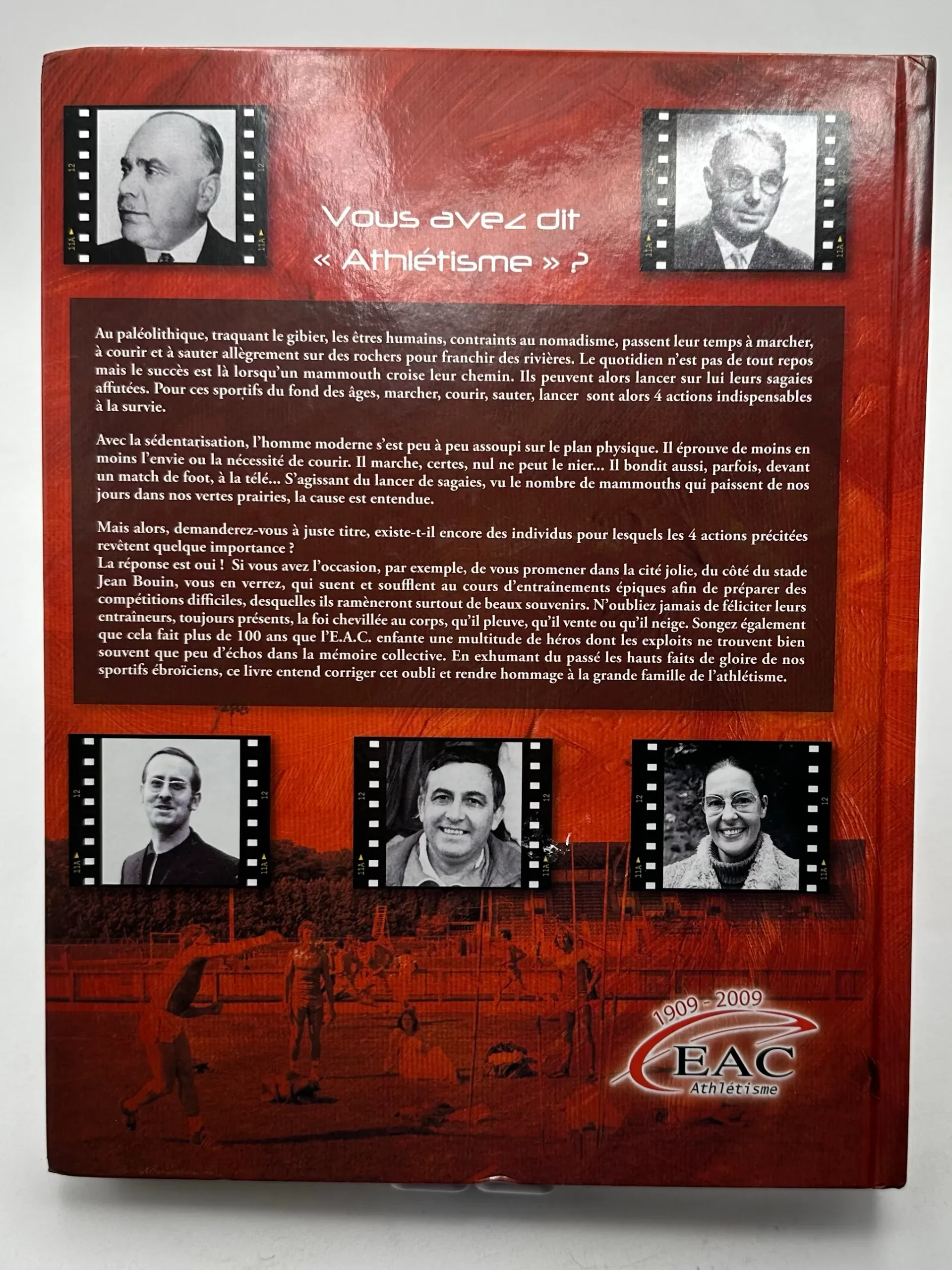 La réponse est oui! Si vous avez l’occasion, par exemple, de vous promener dans la cité jolie, du côté du stade Jean Bouin, vous en verrez, qui suent et soufflent au cours d’entraînements épiques afin de préparer des compétitions difficiles, desquelles ils ramèneront surtout de beaux souvenirs. N’oubliez jamais de féliciter leurs entraîneurs, toujours présents, la foi chevillée au corps, qu’il pleuve, qu’il vente ou qu’il neige. Songez également que cela fait plus de 100 ans que l’E.A.C. enfante une multitude de héros dont les exploits ne trouvent bien souvent que peu d’échos dans la mémoire collective. En exhumant du passé les hauts faits de gloire de nos sportifs ébroïciens, ce livre entend corriger cet oubli et rendre hommage à la grande famille de l’athlétisme.