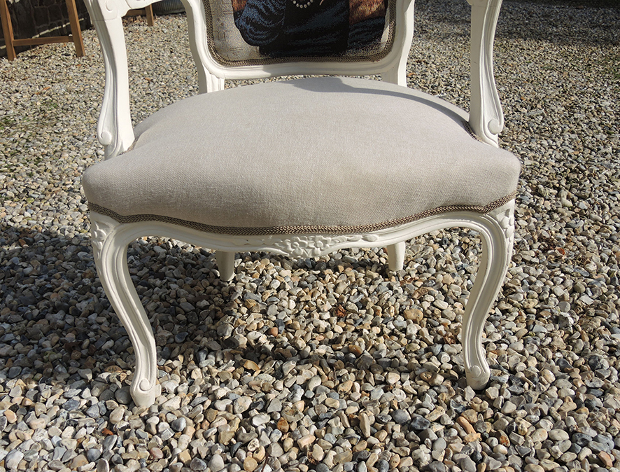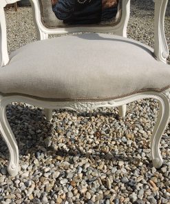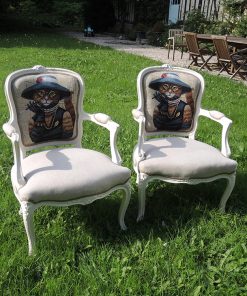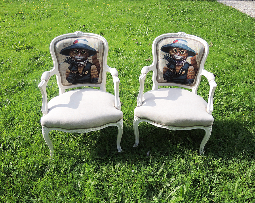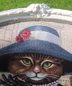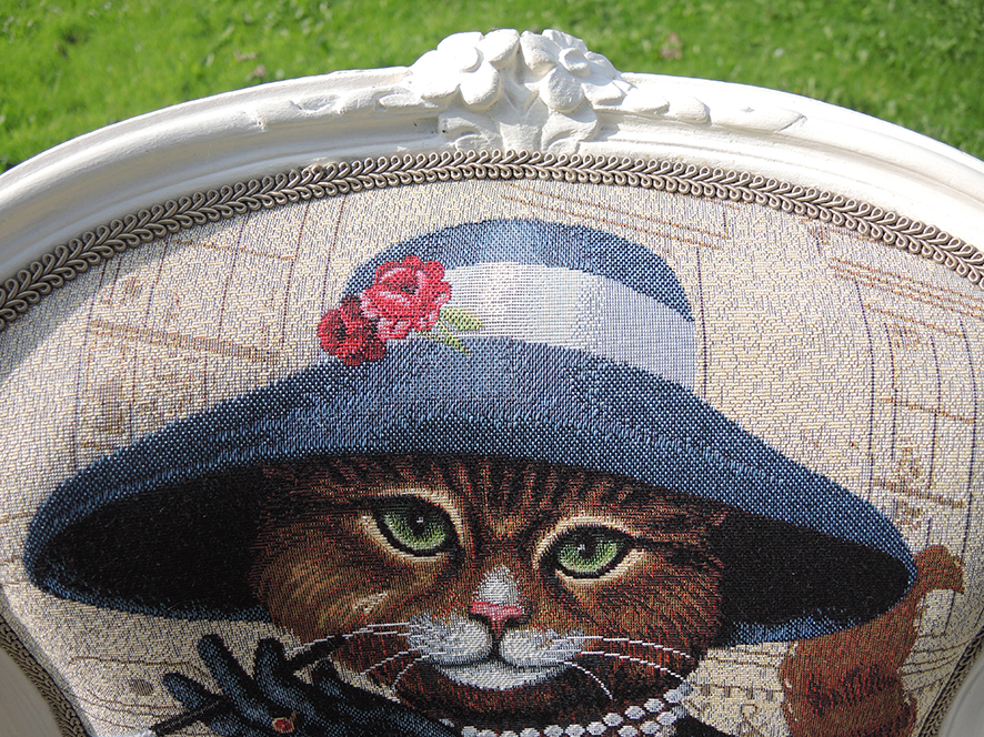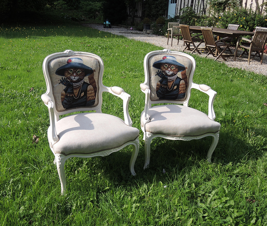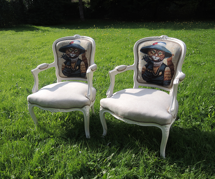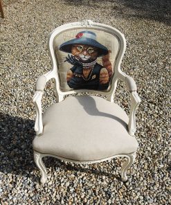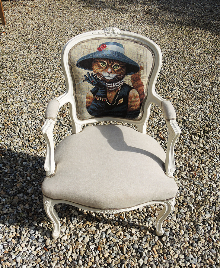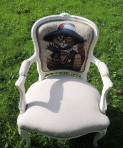 – un dossier décoré d’un chat habillé en vêtements chic et portant un collier en perles, fumant une cigarette. Ce motif donne un ‘twist’ et casse le côté classique du modèles. Mais vous pouvez enlever ces ‘médaillons’ pour retrouver un dossier en lin sans motif, si vous le préférerez.