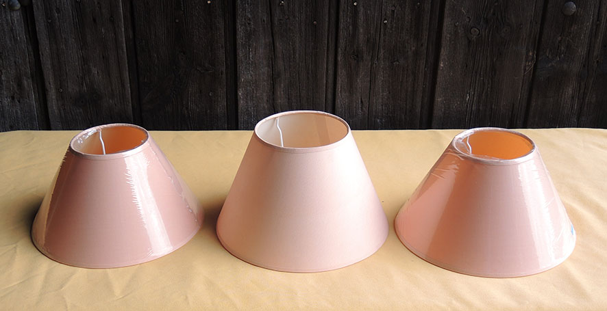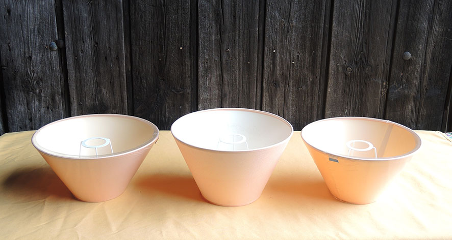 3 anciens abat-jour en papier de couleur rose pêche.
