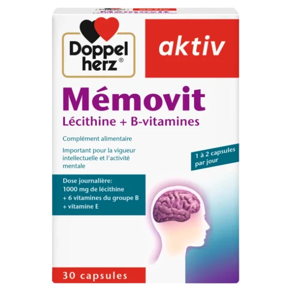 Doppelherz aktiv Mémovit est une combinaison intelligente de lécithine, de vitamine E et de vitamines B élaborée pour soutenir le métabolisme et le fonctionnement des cellules nerveuses, la transmission de l’influx nerveux et la communication entre les neurones.