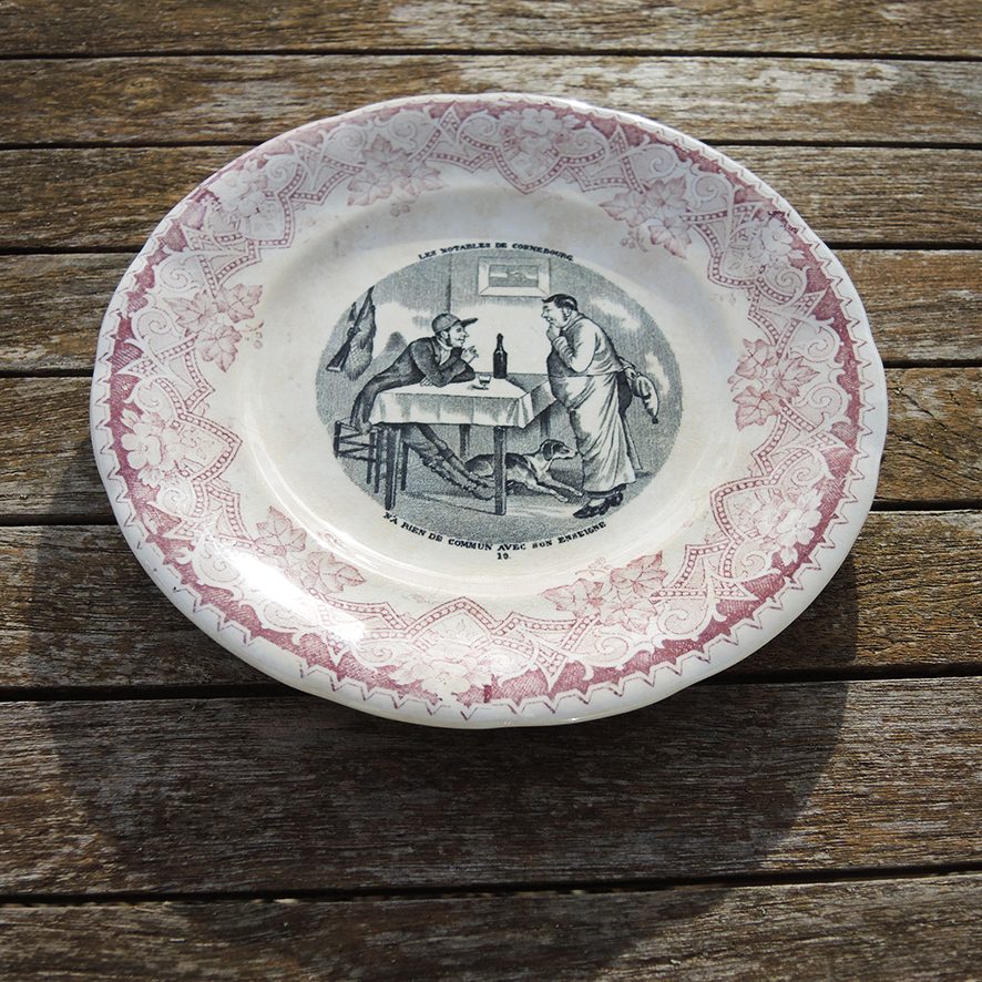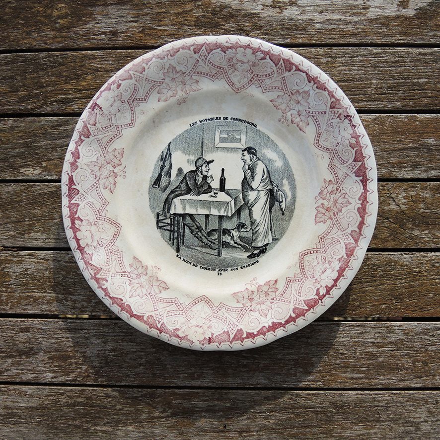 Il s’agit d’une assiette de la série « Les Notables de Cornebourg » en impression noir et rose sur fond blanc :