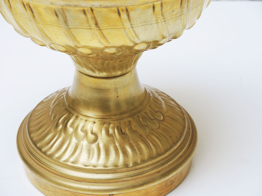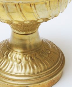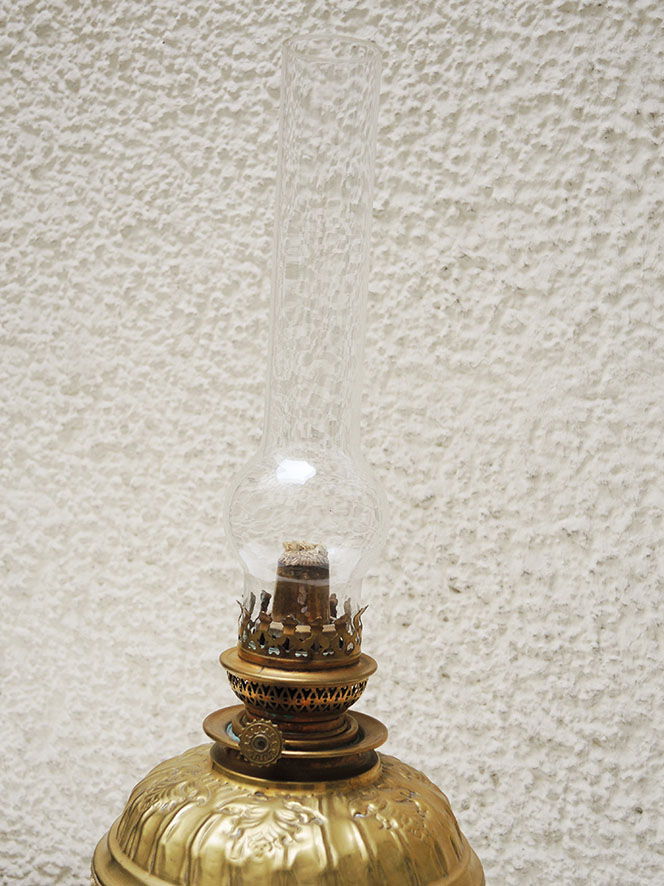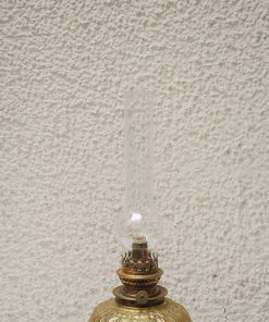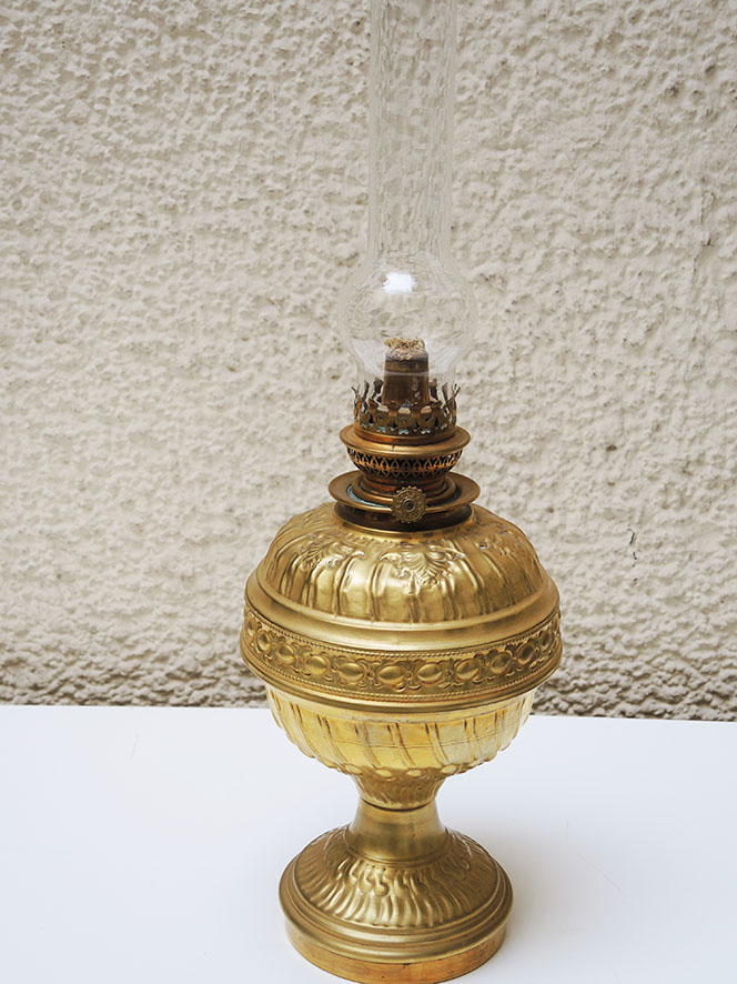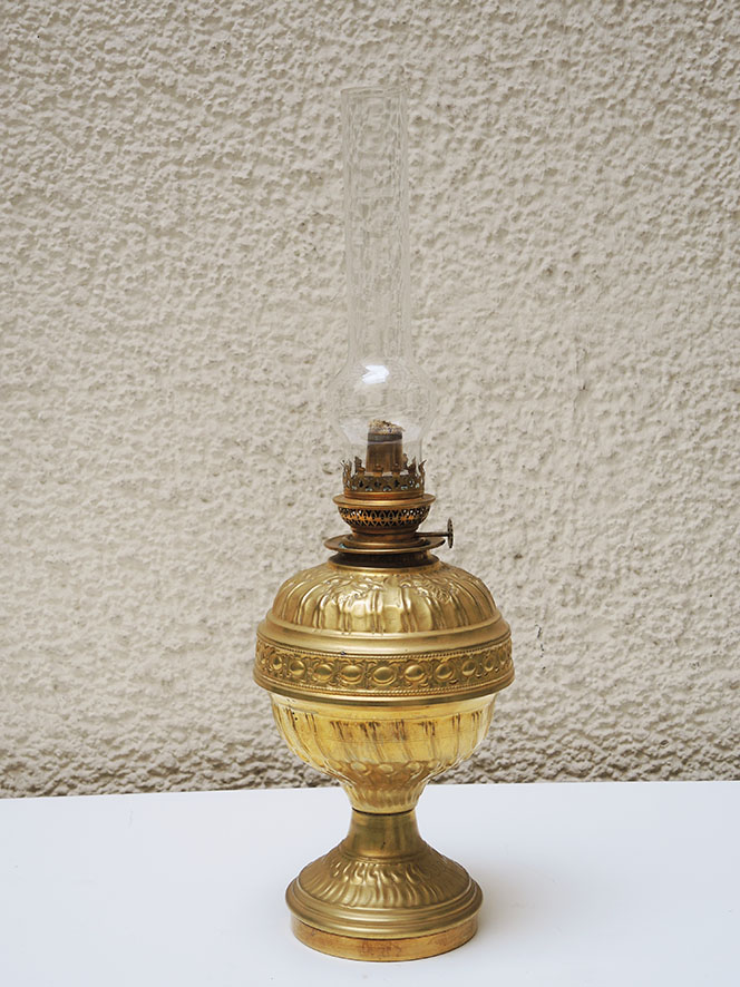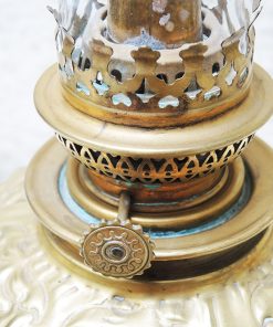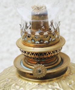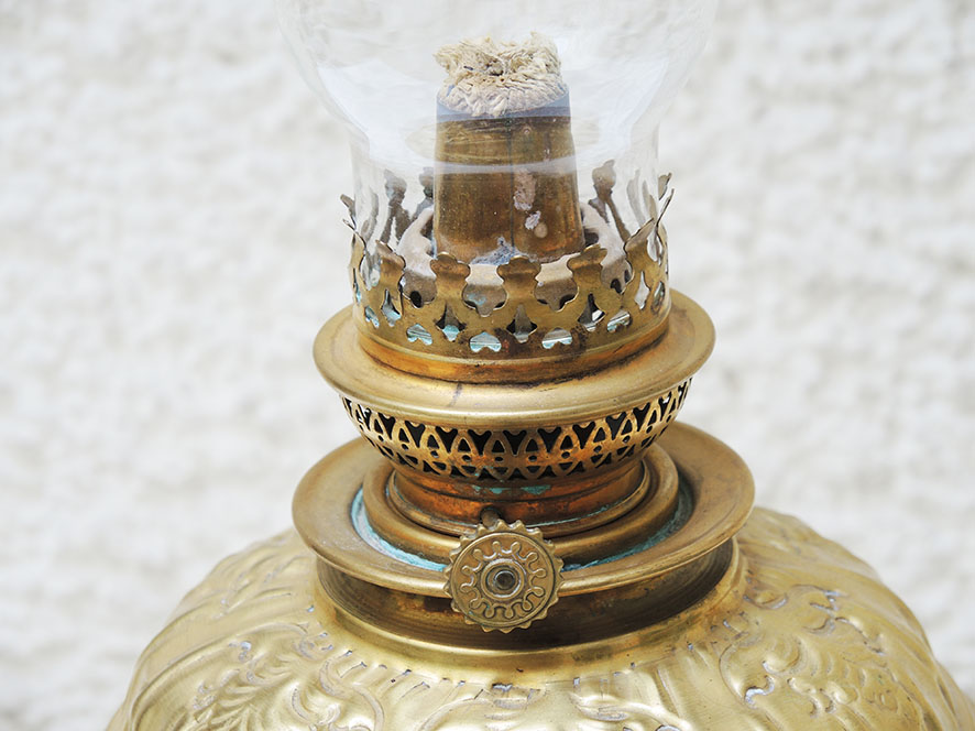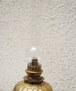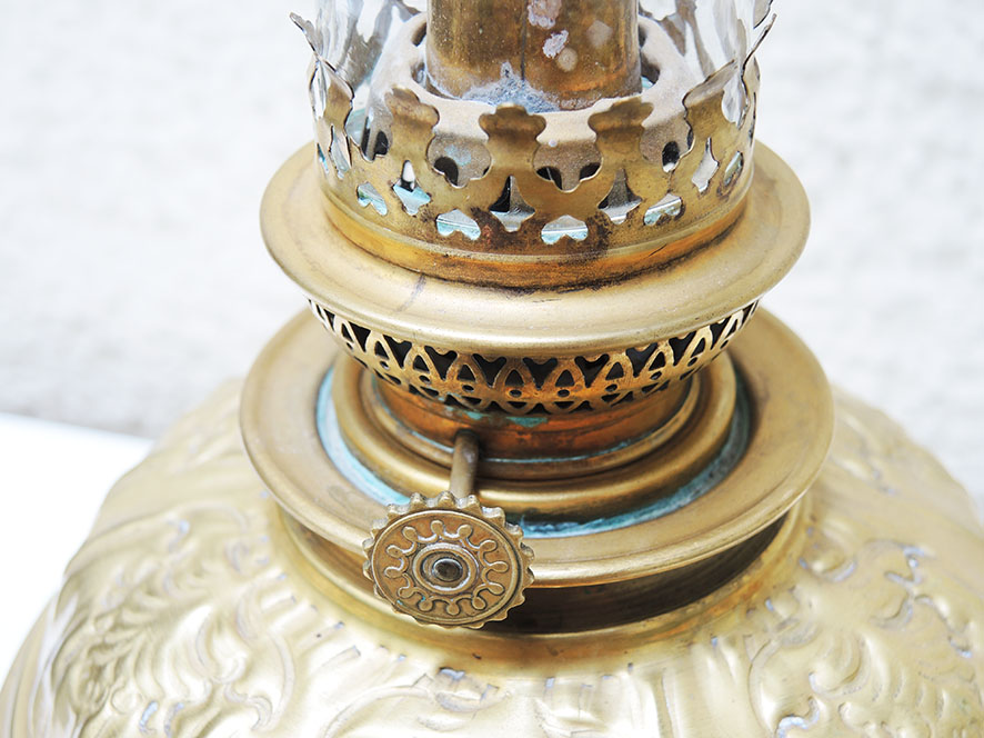 Majestueuse lampe à pétrole vintage en laiton décorée d’ornements du style classique.