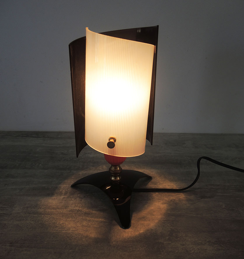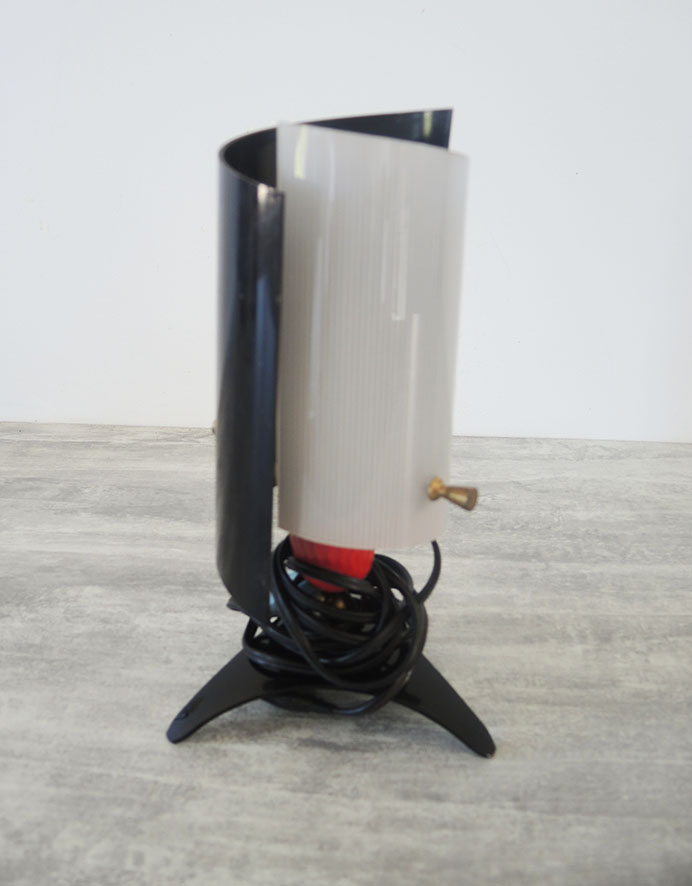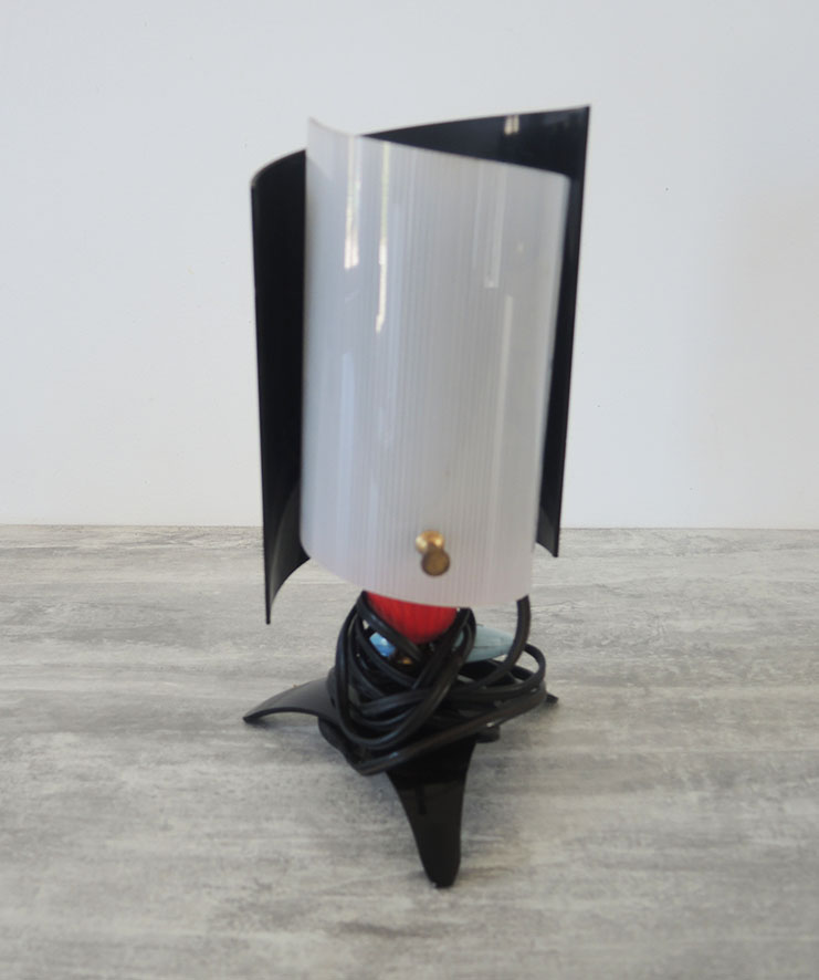 Lampe à poser vintage datant des années 50 / 60 décorée d’un abat-jour en plastique blanc et noir en contraste par un pied en bakélite rouge et noir.