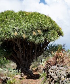 L’Arbre Dragon (Dracena draco) est une plante arbustive à croissance lente originaire des îles Canaries. Reconnaissable par son tronc épais et bulbeux, ses branches épaisses et ses feuilles vert foncé en forme d’épée, l’Arbre Dragon peut atteindre jusqu’à 10 mètres de hauteur. Il est souvent cultivé comme plante ornementale dans les jardins et les intérieurs en raison de son aspect exotique et de sa facilité d’entretien. Son nom provient de la légende selon laquelle le sang des dragons aurait coulé de ses feuilles après des combats entre ces créatures mythiques.
