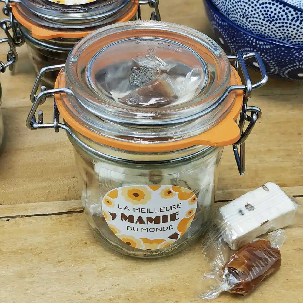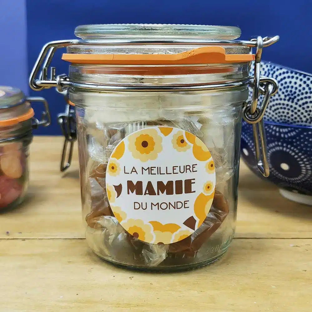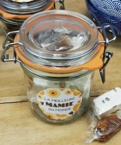 Faites plaisir à votre Mamie en lui offrant un cadeau original avec ce petit bocal LE PARFAIT réutilisable “Meilleure mamie du Monde”. Pour la fête des grand-mères par exemple ! Un Joli Bocal contenant des caramels et nougats. Elle sera ravie de redécouvrir les saveurs de son enfance.