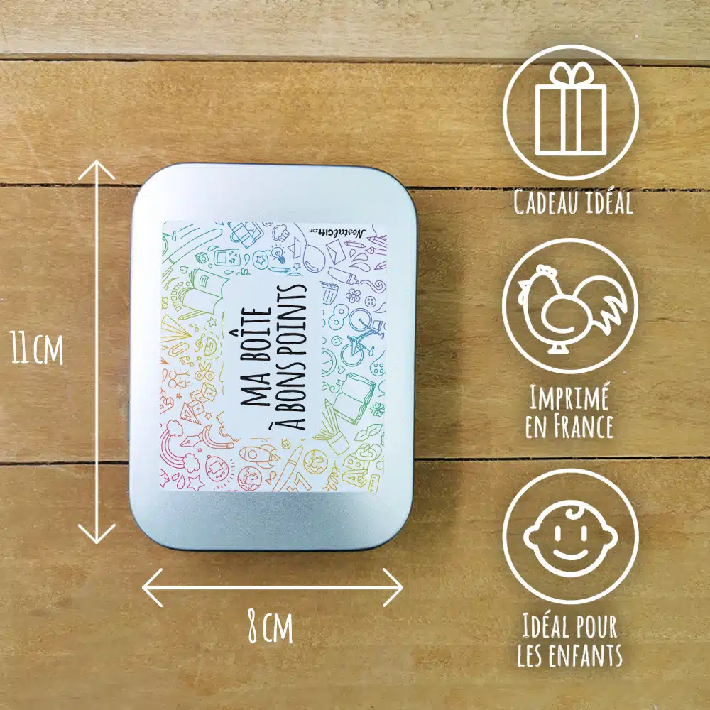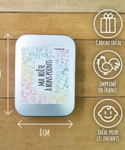 Offrez cette boite à cadeau qui reste pour une fille pour la rentrée scolaire de votre fille. Sur cette boîte à bons points il sera écrit “Ma boîte à bons points” sur l’avant. Avec sa contenance de 150ml, cette boite en fer blanc légère est idéale pour le cartable de votre enfant, de plus ce métal est recyclable à l’infini, c’est donc bon pour la planète.