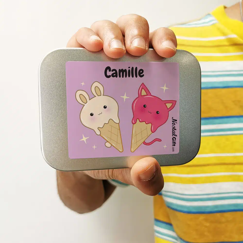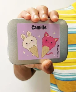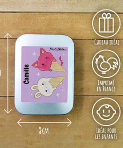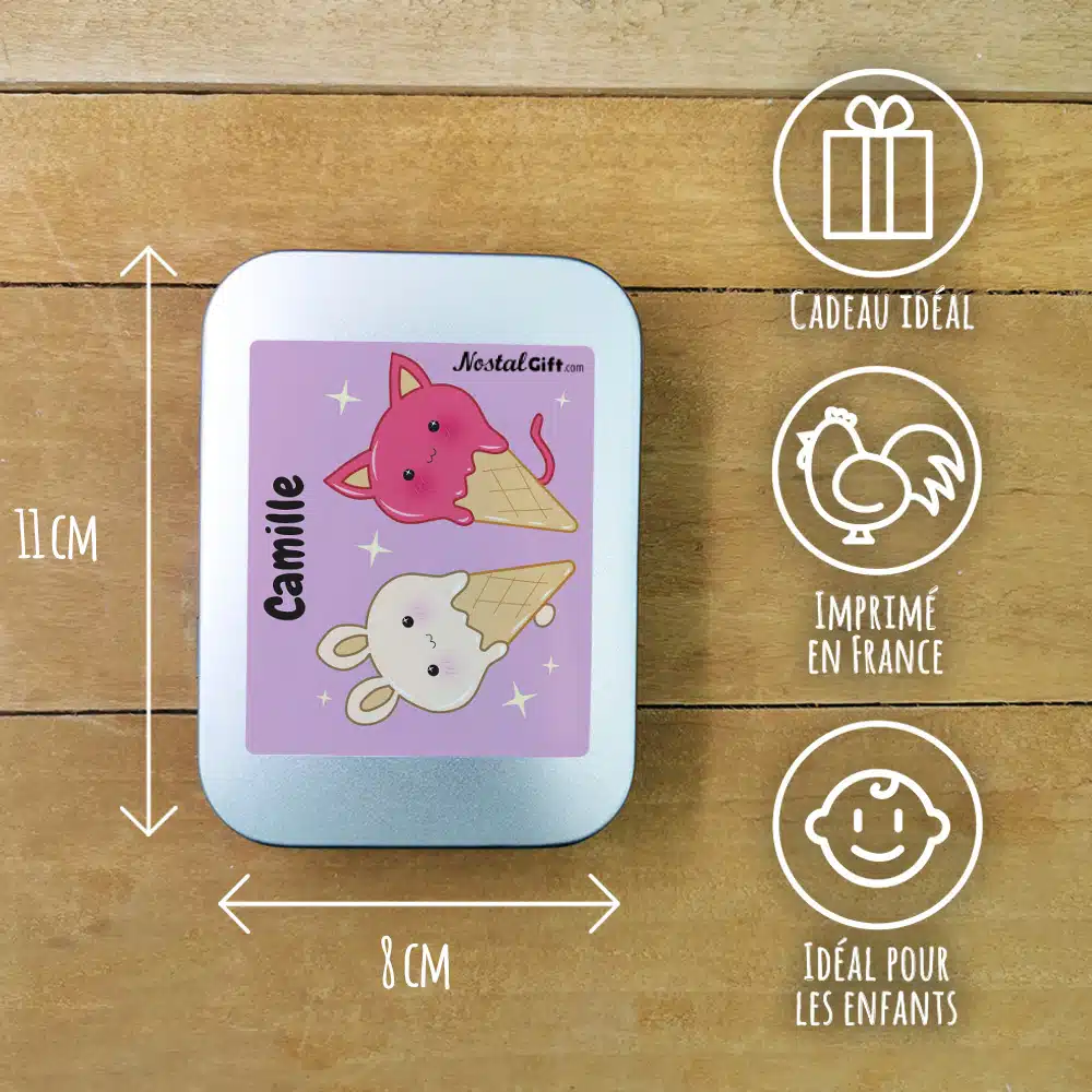 Offrez cette boite à cadeau qui fait plaisir pour une fille pour la rentrée scolaire de votre fille. Sur cette boîte à bons points il sera écrit ” prénom de votre enfant” sur l’avant grâce à votre personnalisation. Avec sa contenance de 150ml, cette boite en fer blanc légère est idéale pour le cartable de votre enfant, de plus ce métal est recyclable à l’infini, c’est donc bon pour la planète.