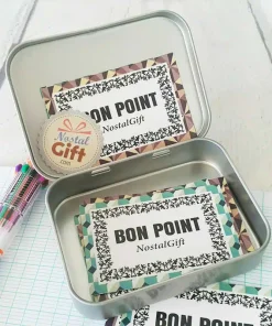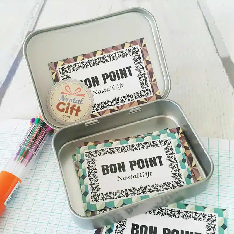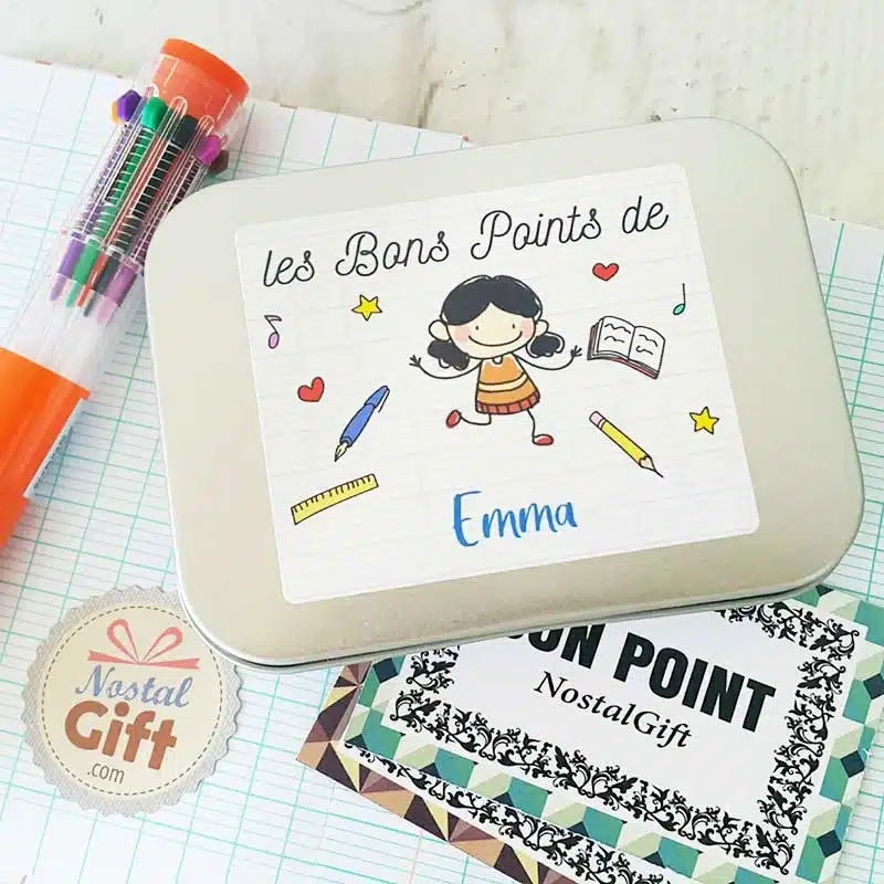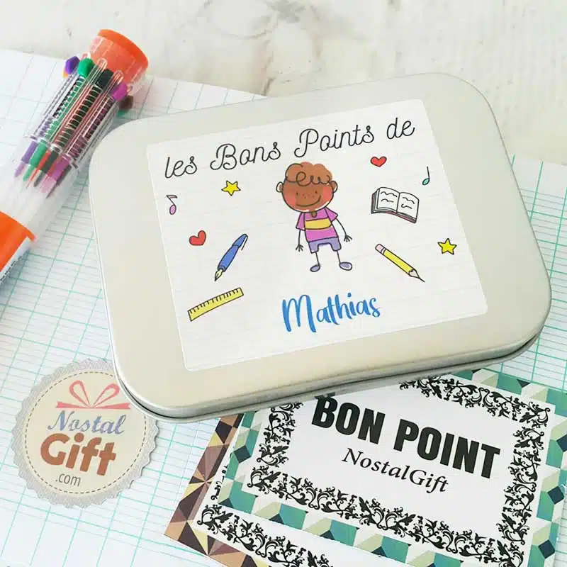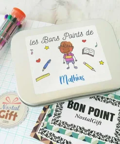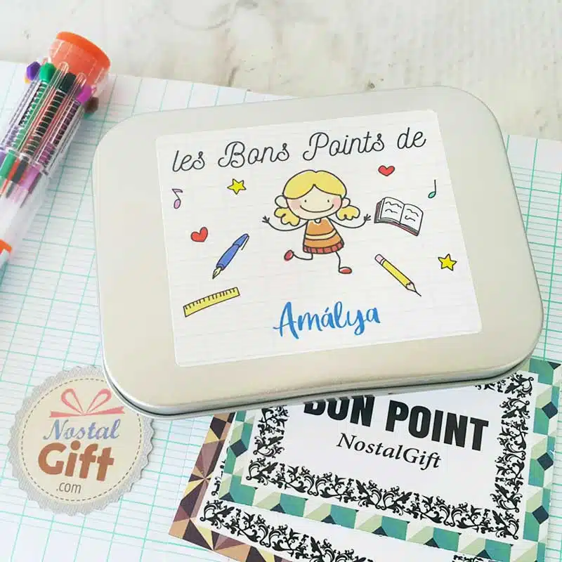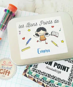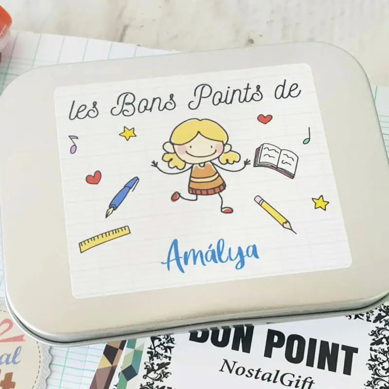 Avez-vous été sage ? Dans les années 80, les maîtresses distribuaient les bons points aux bons élèves. Et pour certains, au bout de 10 bons points, nous avions droit à une image. Le Graal ! Découvrez notre version de boîte en métal à personnaliser avec le prénom de votre enfant. Vous pouvez choisir la couleur de ses cheveux et de son teint.