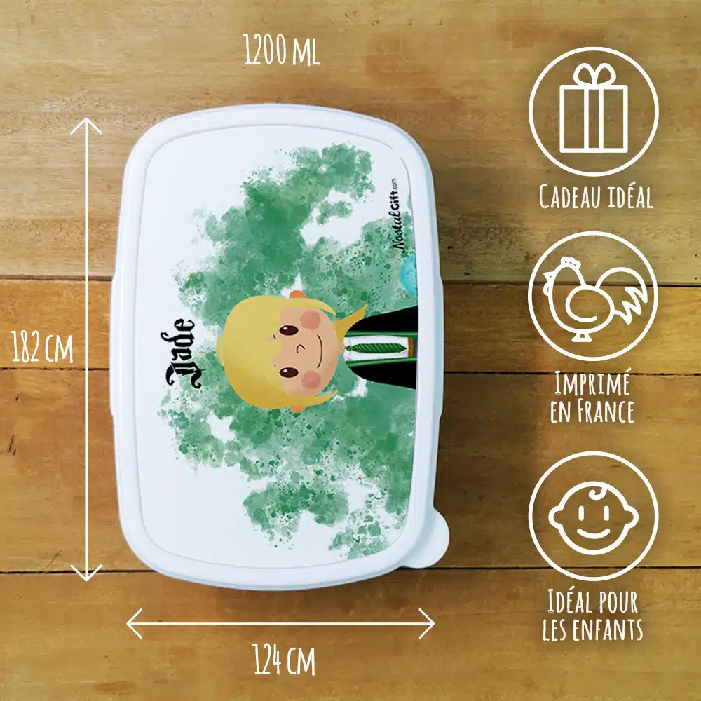 Cette boite à gouter est parfaite pour un cadeau pour cadeau qui dure pour une fille pour halloween ou la rentrée scolaire de votre fille. Sur cette boîte à gouter, il sera écrit ” le prénom de votre fille ” sur l’avant grâce à votre personnalisation. En plastique et avec une fermeture hermétique, cette boite est idéale pour le sac de sport ou le cartable de votre enfant.