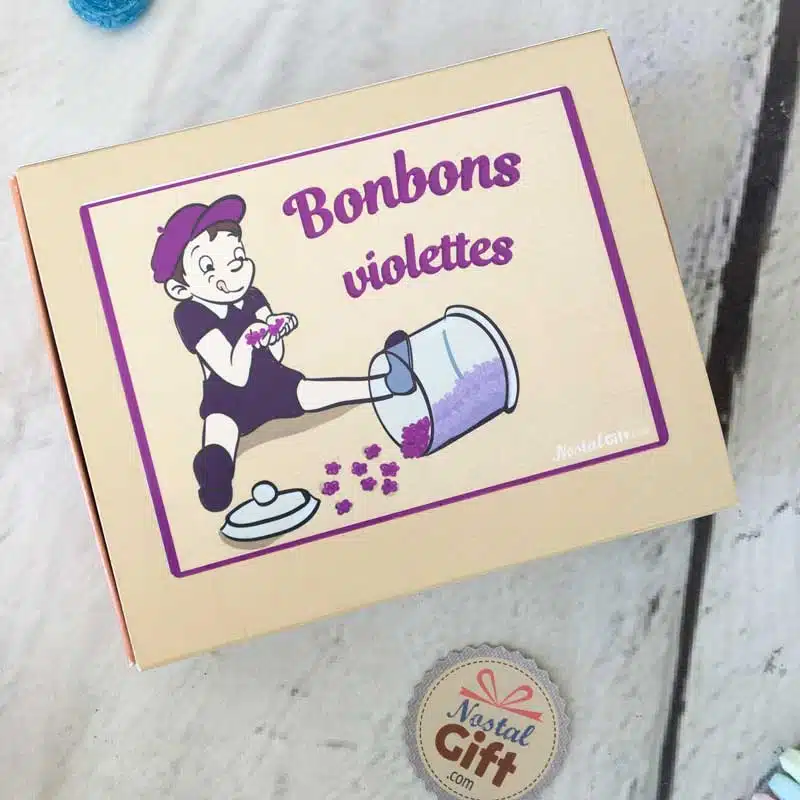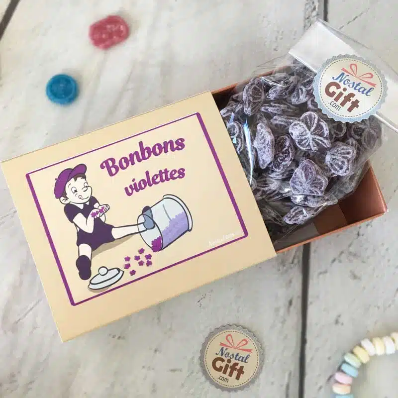 La boîte de bonbons violettes est livrée dans une jolie petite boîte format allumette. Elle contient : 80 pastilles environ