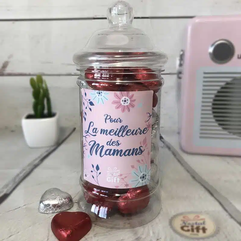 Des chocolats en forme de cœur et une bonbonnière retro pour une mère exceptionnelle.  Appréciez la vue de vos bonbons à l’intérieur de cette petite et mignonne bonbonnière ! Nous vous proposons à l’intérieur une gamme de bonbons d’antan délicieux et colorés, pour que vous en ayez plein la vue !