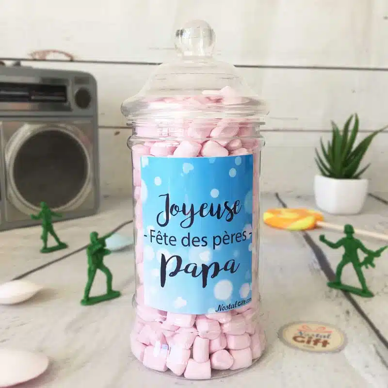 Appréciez la vue des mini guimauves (ou chamallow) tendres et toutes roses à l’intérieur de cette petite et mignonne bonbonnière ! Parfaite pour un papa génial, nous vous proposons à l’intérieur une gamme de bonbons d’antan délicieux et colorés. Ravissez vos papilles. A savourer sans modération pour les grandes comme les petites faims.