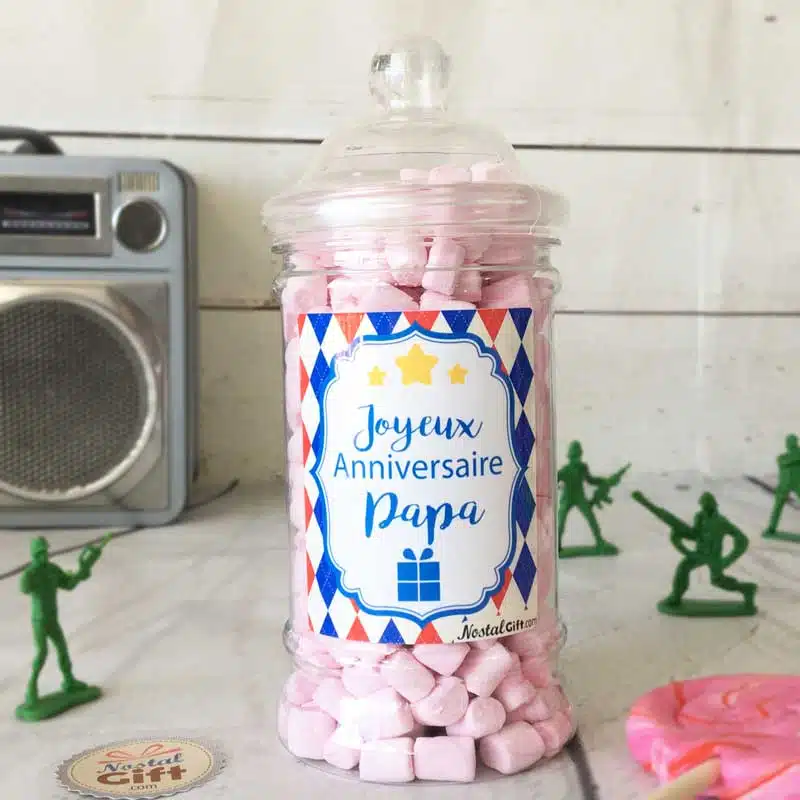 Papa est le meilleur. Pour son anniversaire, offrez-lui des mini guimauves (ou chamallow) tendres et toutes roses à l’intérieur de cette petite et mignonne bonbonnière ! Nous vous y proposons une gamme de bonbons d’antan délicieux et colorés. Ravissez vos papilles.