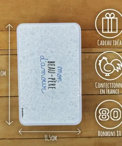 Couleur de la boîte : Blanche sur le dessous et les coté et imprimé avec “Mon beau-père d’amour” en bleu