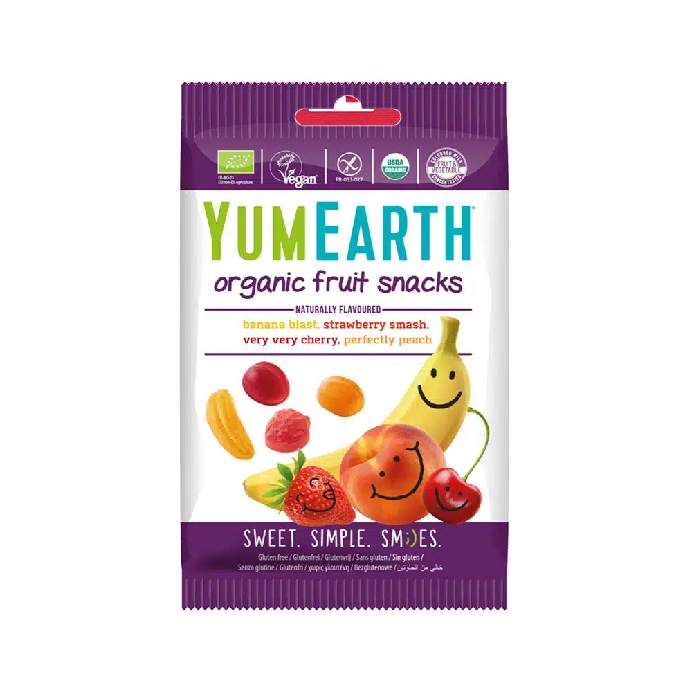 Assortiment de bonbons mous aux saveurs de banane, pêche, cerise et fraise. Certifiés Vegan et sans gluten. Ingrédients issus de l’agriculture biologique. Sachet de 50g. Découvrez les bonbons Fruit Snacks de YumEarth ! Ces bonbons Fruit Snacks de YumEarth mous en forme de fruits aux délicieuses saveurs de banane, pêche, cerise et fraise si appréciées des enfants, raviront également les plus grands. Ces bonbons Fruit Snacks de YumEarth sont certifiés bio, sans gluten et vegan. Dès l’âge de 3 ans.