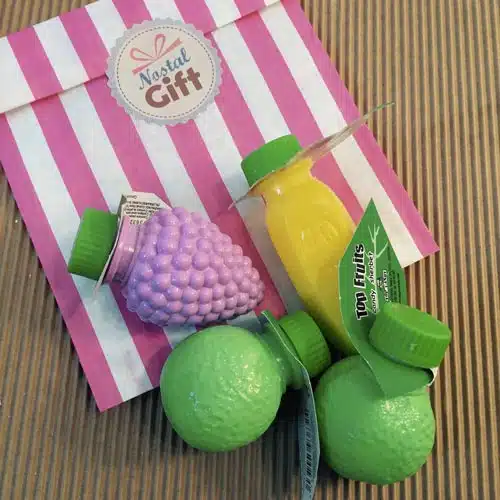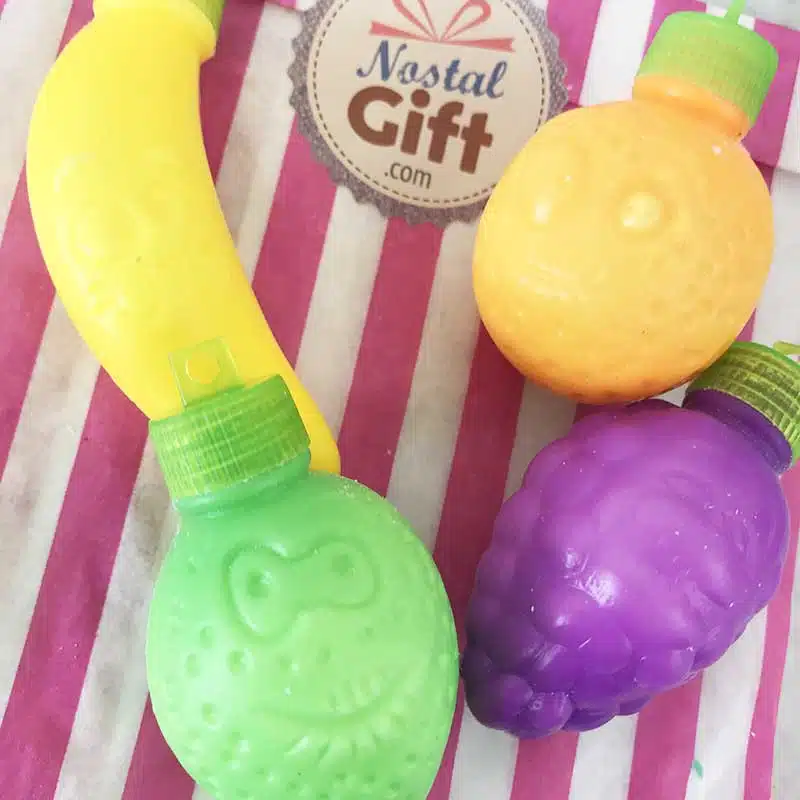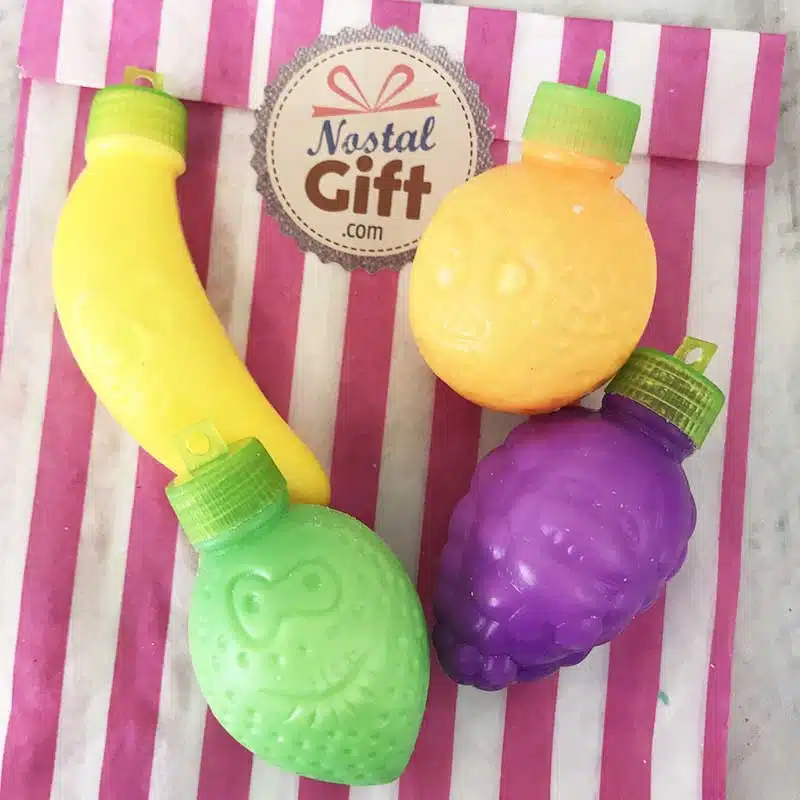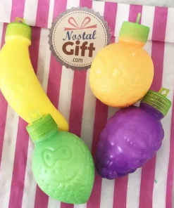 Retrouvez le charme rétro de ces friandises en forme de petites bouteilles en plastique qui ressemblent étrangement à de véritables fruits. Que ce soit une pomme croquante, une banane ensoleillée, une fraise juteuse, une orange rafraîchissante ou un raisin délicatement sucré, NostalGift.com vous offre la possibilité de retrouver ces délices des années 80.