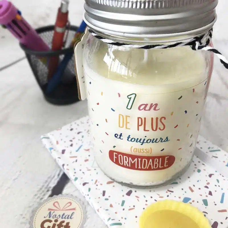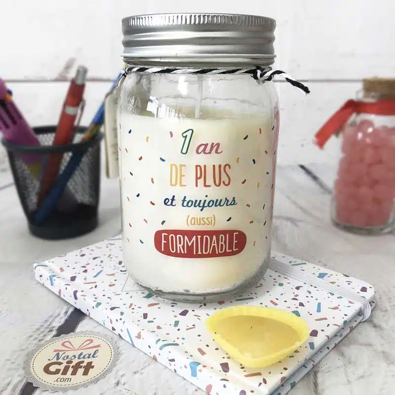 Bougie jar – Joyeux anniversaire – “1 an de plus et toujours (aussi) formidable”