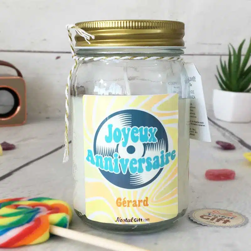 Bougie Jar personnalisée “Joyeux anniversaire” – Années 70 – Cadeau anniversaire