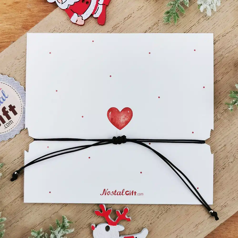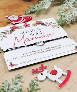 – Inscriptions : “Joyeux Noël Maman” “Ferme les yeux et fais un voeu. Quand le bracelet se brisera, ton souhaite se réalisera””de la part de : ”