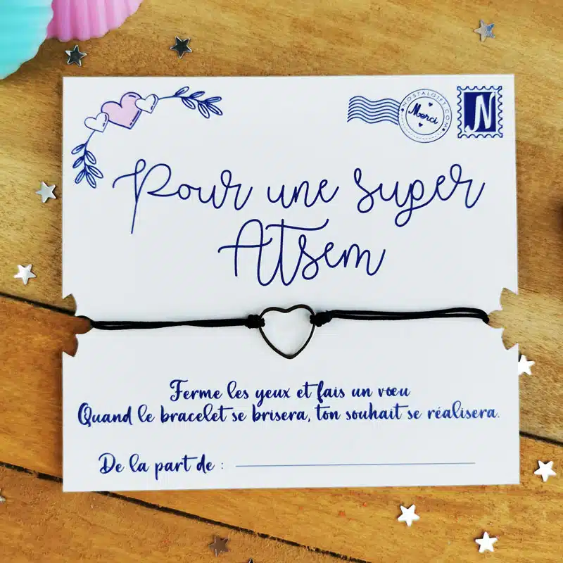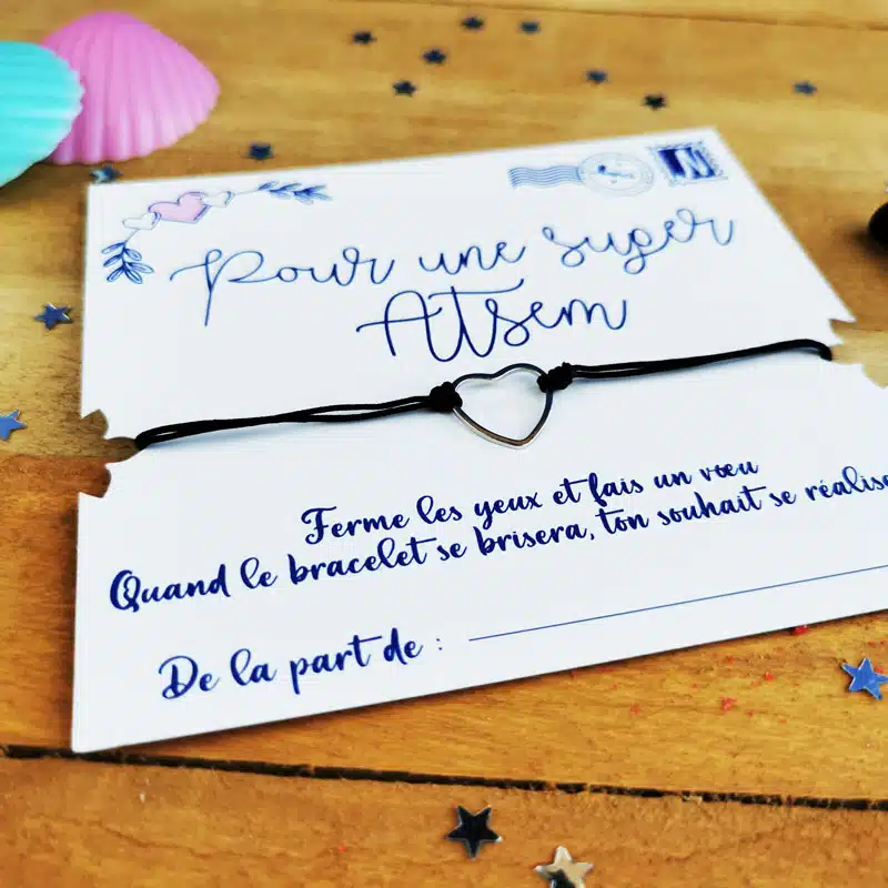 – Inscriptions : “Pour une super atsem” “Ferme les yeux et fais un voeu. Quand le bracelet se brisera, ton souhaite se réalisera””de la part de : ”