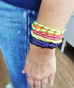 Un bracelet fluo au style cordage comme dans les années 80 ! On était à la mode avec les couleurs fluo à l’époque. C’était l’accessoire de tendance qu’il fallait et que nous prenons plaisir à retrouver aujourd’hui.