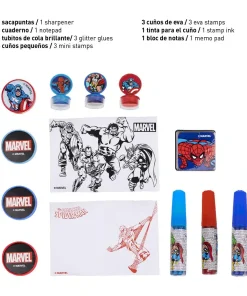 – Coffret contenant : 6 crayons, 3 feutres, 2 crayons de cire, 3 colles à paillettes, 2 gommes, 1 encreur, 6 tampons, 10 autocollants, 1 bloc note, 2 feuilles de coloriage.