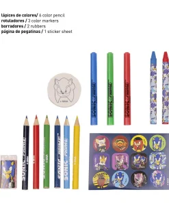 – Coffret contenant : 6 crayons, 3 feutres, 2 crayons de cire, 3 colles à paillettes, 2 gommes, 1 encreur, 6 tampons, 10 autocollants, 1 bloc note, 2 feuilles de coloriage.