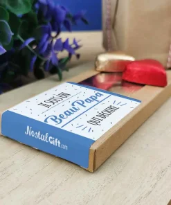 Packaging : Boîte cartonné avec fenêtre plastifié et autocollant avec l’inscription Je suis un Beau Papa qui déchire aux couleurs bleu