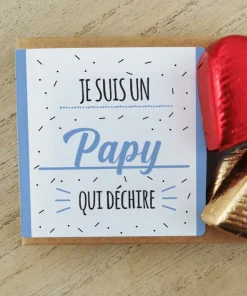 – Packaging : Boîte cartonnée avec fenêtre plastifiée et autocollant avec l’inscription “Je suis un papy qui déchire” aux couleurs bleu