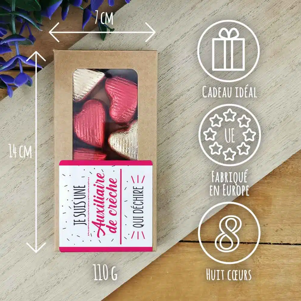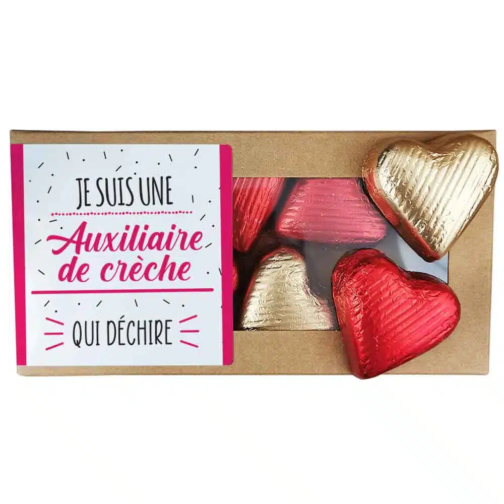 Offrez à votre auxiliaire de crèche un cadeau gourmand et délicieux avec ces chocolats laits et pralinés. De quoi faire fondre la personne à qui vous voulez l’offrir !
