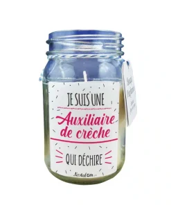 Packaging : Boîte cartonné avec fenêtre plastifié et autocollant avec l’inscription Je suis une auxiliaire de crèche qui déchire aux couleurs rose