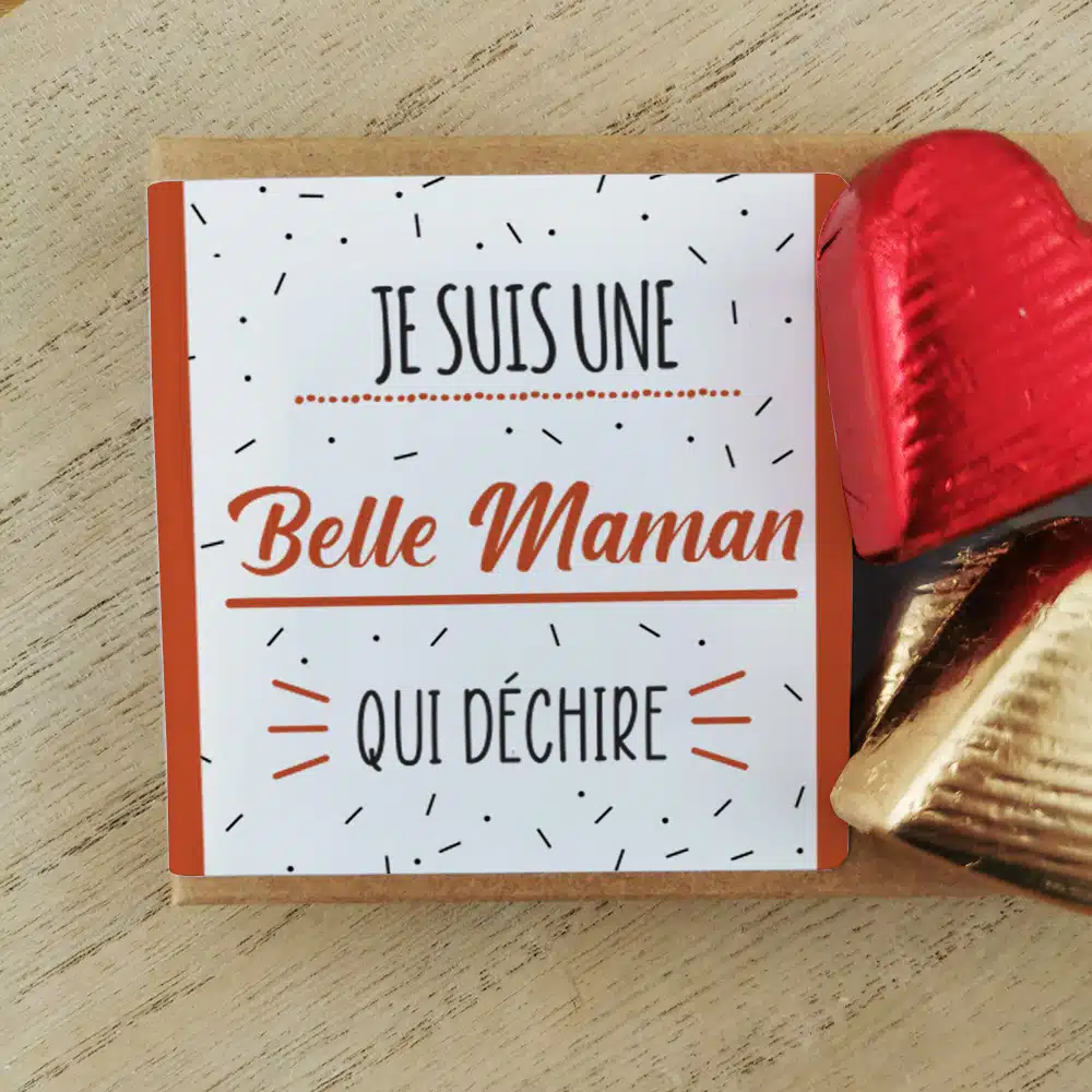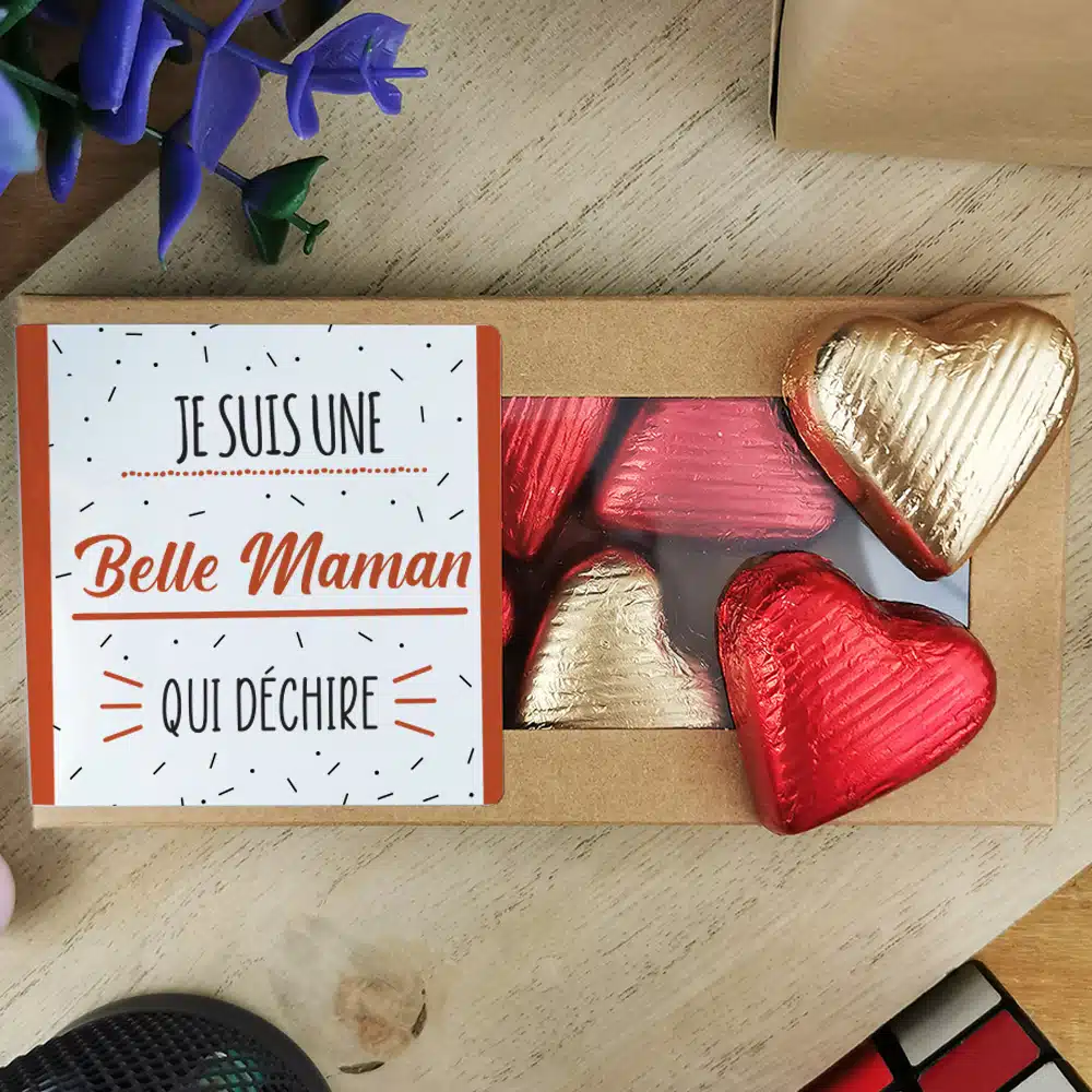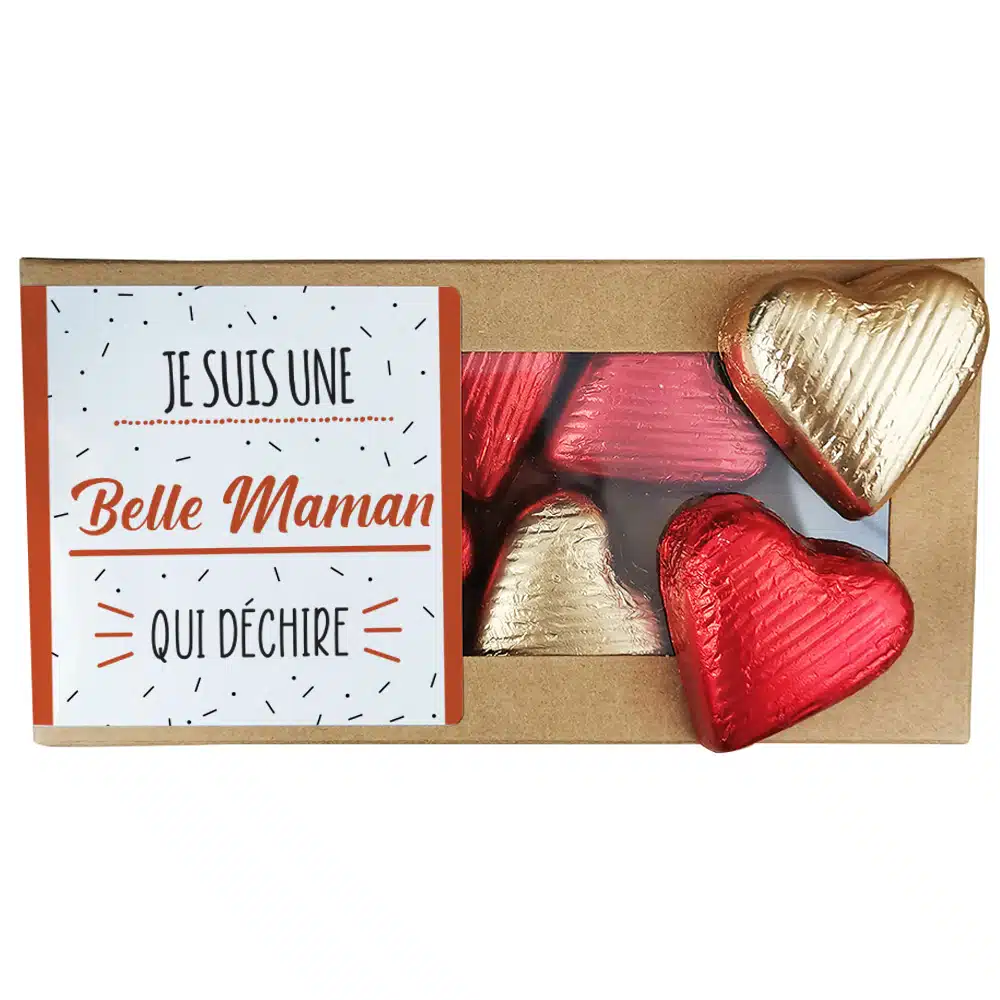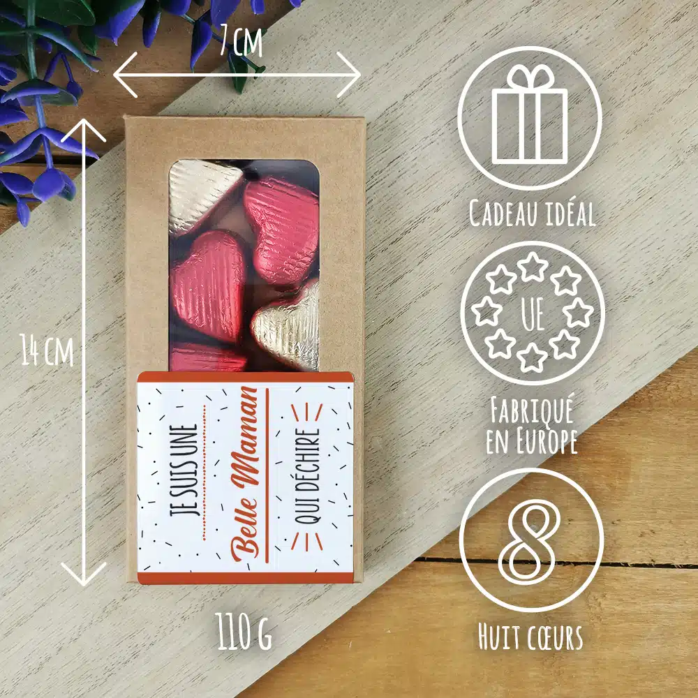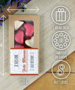 Cœurs au chocolat au lait et chocolat noir praliné x8 avec décor au design Qui déchire – Cadeau au joli design pour la fête des mères ou fêter un anniversaire : belle maman