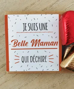 – Inscription : Je suis une belle maman qui déchire- Quantité : vendu par 8- Poids : 110 grammes- Goût : 4 chocolats au lait fourrés au praliné et 4 chocolats noir fourrés au praliné– Conservation : Les chocolats doivent être conservés au sec et à l’abri de la chaleur.– Dimensions de la boite : 7x13cm– Couleur : bordeaux- Packaging : Boîte cartonné avec fenêtre plastifié et autocollant avec l’inscription Je suis une belle maman qui déchire aux couleurs bordeaux