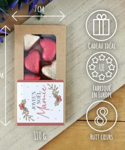 Cœurs au chocolat au lait et chocolat noir praliné x8 avec décor au design Joyeux Noël Floral