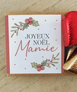 – Packaging : Boîte cartonnée avec fenêtre plastifiée et autocollant avec l’inscription Joyeux Noël Mamie aux couleurs vert et rouge