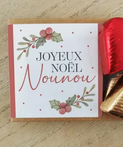 – Packaging : Boîte cartonnée avec fenêtre plastifiée et autocollant avec l’inscription Joyeux Noël Nounou aux couleurs vert et rouge
