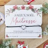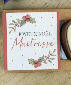– Packaging : Boîte cartonnée avec fenêtre plastifiée et autocollant avec le texte Joyeux Noël Maîtresse aux couleurs vert et rouge.