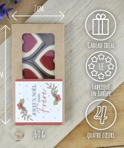 – Packaging : Boîte cartonnée avec fenêtre plastifiée et autocollant avec le texte Joyeux Noël mon frère aux couleurs vert et rouge.