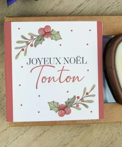 – Packaging : Boîte cartonnée avec fenêtre plastifiée et autocollant avec le texte Joyeux Noël Tonton aux couleurs vert et rouge.