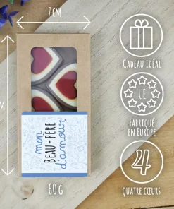 Offrez un cadeau de Noëlau joli designpour beau pere gourmand et délicieusement pour fêter un anniversaire ou Noël avec ces chocolats laits en forme de coeur. De quoi faire fondre la personne à qui vous voulez l’offrir !