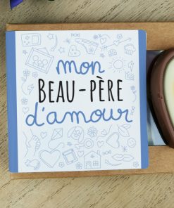 – Packaging : Boîte cartonnée avec fenêtre plastifiée et autocollant avec le texte Mon beau-père d’amour aux couleurs bleu.