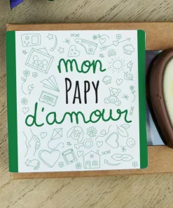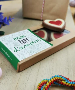 – Packaging : Boîte cartonnée avec fenêtre plastifiée et autocollant avec le texte mon papy d’amour aux couleurs vert.