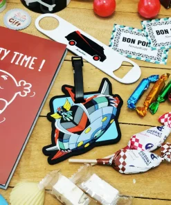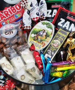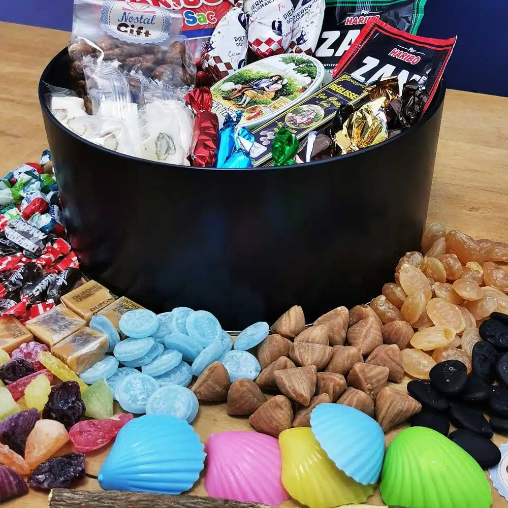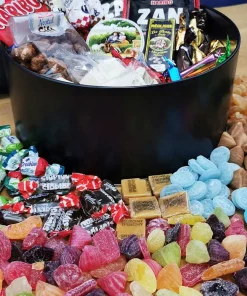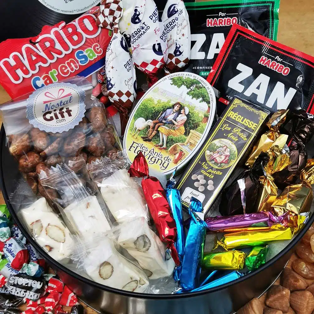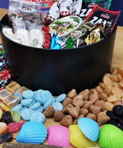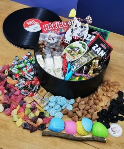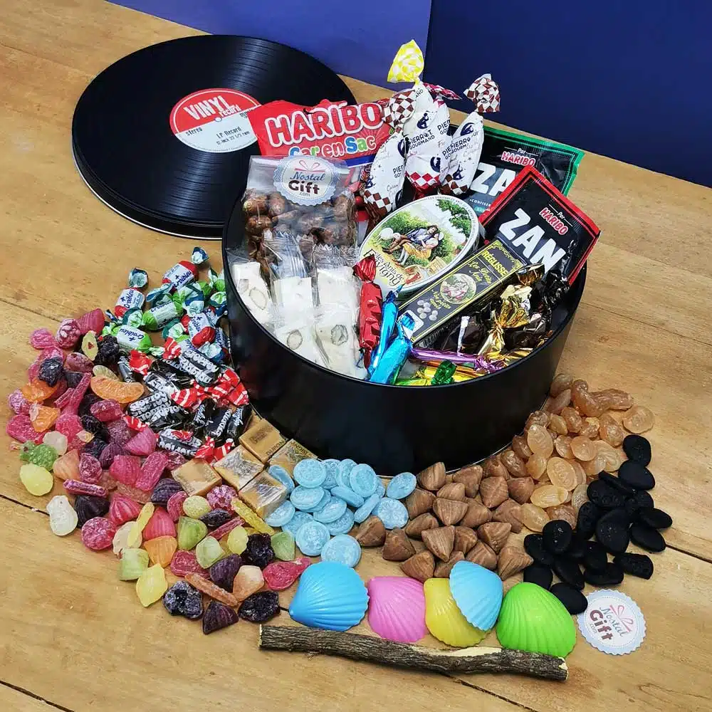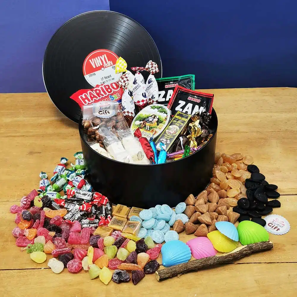 L’ensemble contient plus de 1,2 kg de bonbons et est livrée dans une grande boîte en metal ronde réutilisable (22,5x15x7,5 cm) au design Vinyl. La boîte est remplie de bonbons.