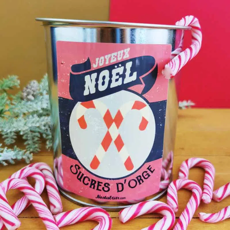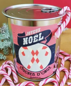 Un beau cadeau pour les nostalgiques des bonbons d’enfance ! Ils retrouveront les sucres d’orges… Et le tout livré dans une très jolie boîte de conserve en métal rose avec l’inscription ” Joyeux Noël” !