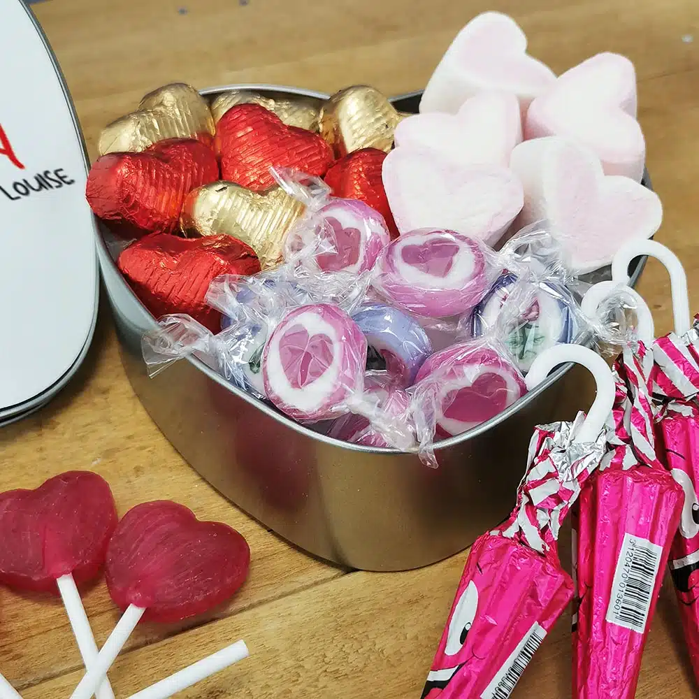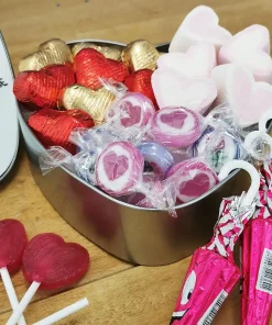 Le cadeau idéal pour la fête des grands-mères. Ce coffret bonbons et chocolats est livré dans une boîte en forme de cœur en métal, avec sur le couvercle les prénoms des petits enfants de votre mamie. Elle pourra déguster les chocolats et confiseries de ce coffret.