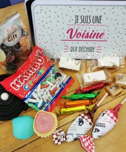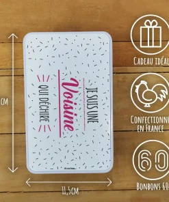Bonbons des années 60 – “Je suis une voisine qui déchire” (Boîte en métal) – cadeau personnalisé