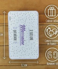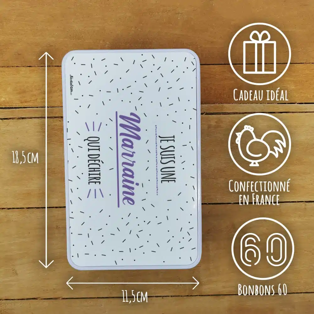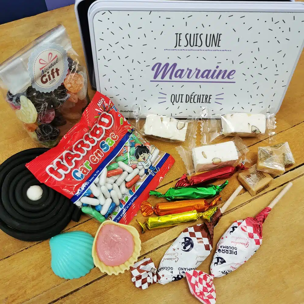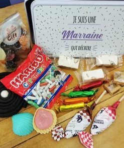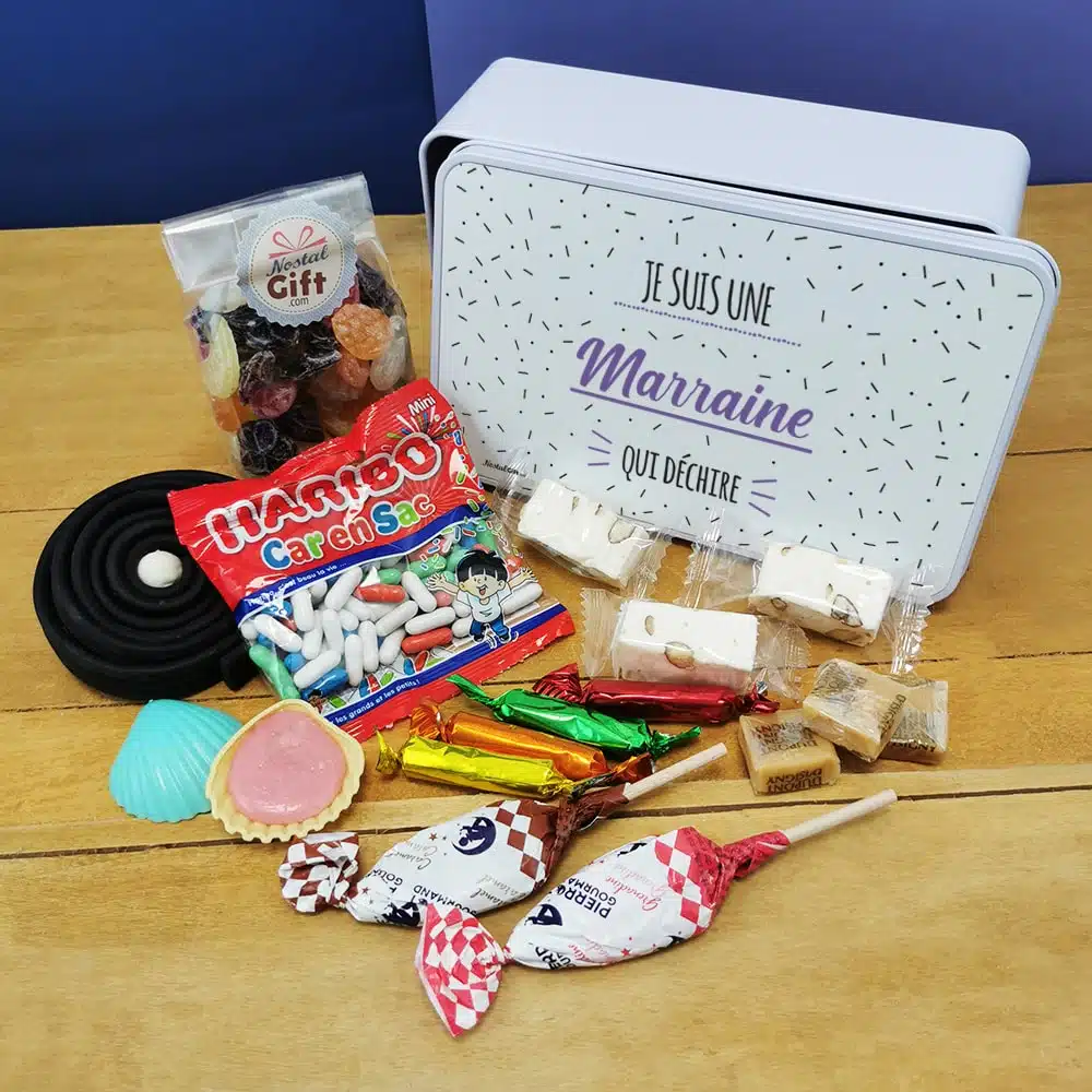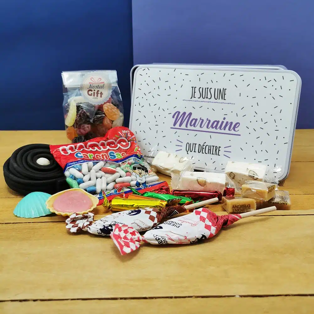 Le coffret cadeau bonbons des années 60 “Marraine Qui Déchire” contient :
