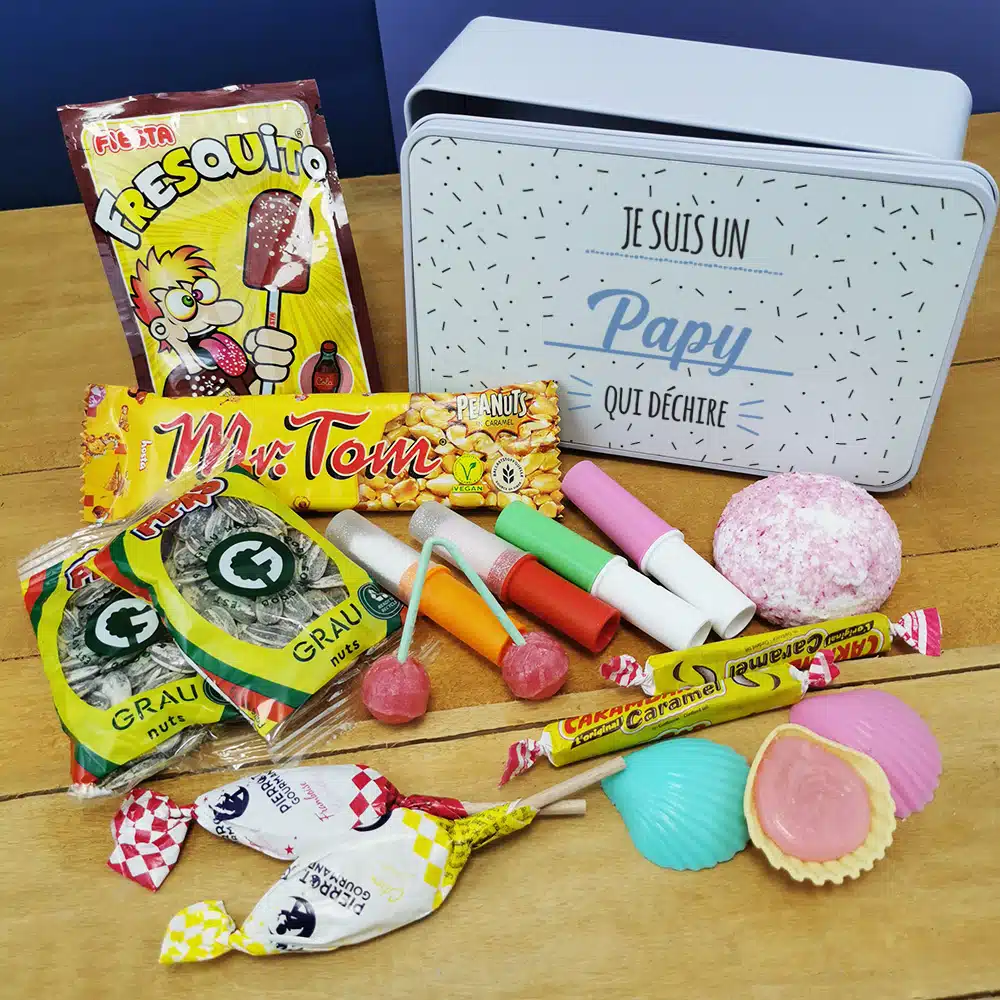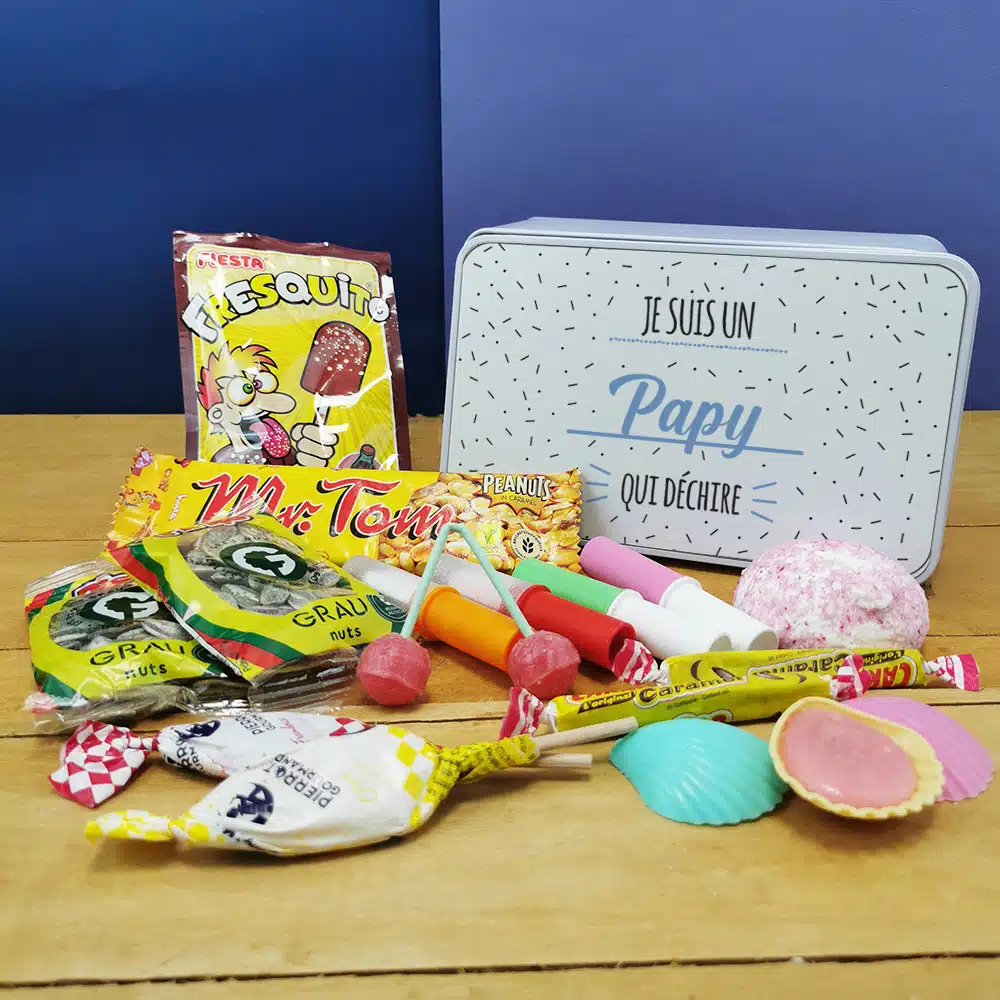 Le coffret cadeau bonbons des années 70 “Je suis un papy qui déchire” contient :