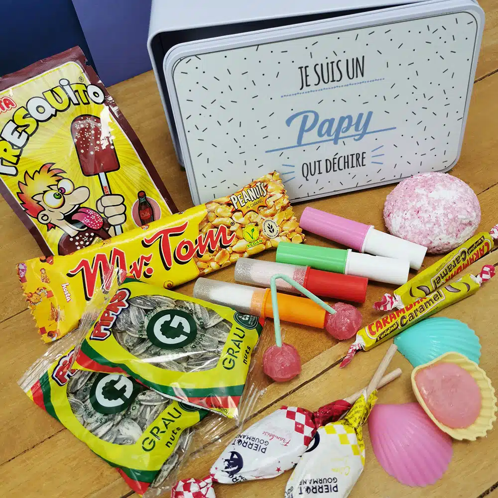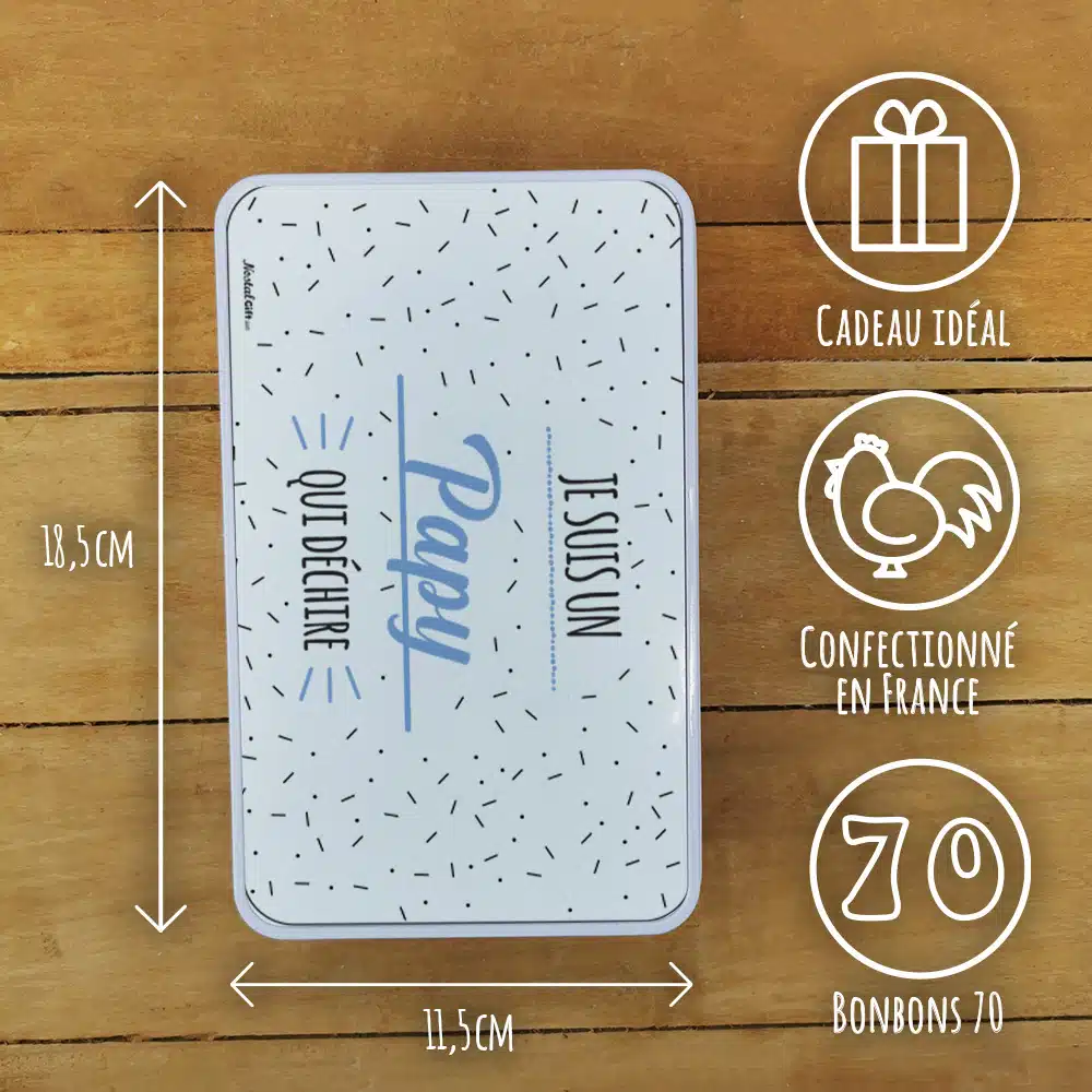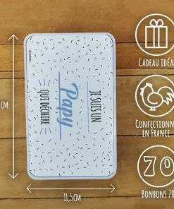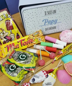 Bonbons des années 70 “Je suis un papy qui déchire” (Boîte en métal)