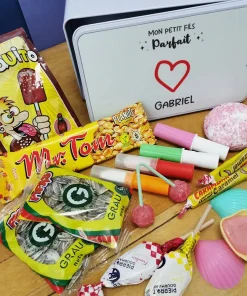 Le coffret cadeau bonbons des années 70 “Mon petit fils parfait” contient :
